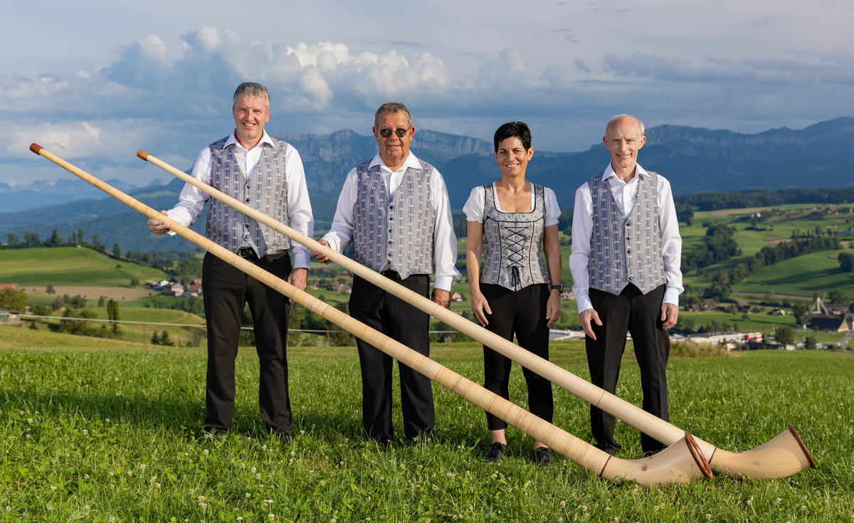 Die Mitglieder der Alphorngruppe von links nach rechts: